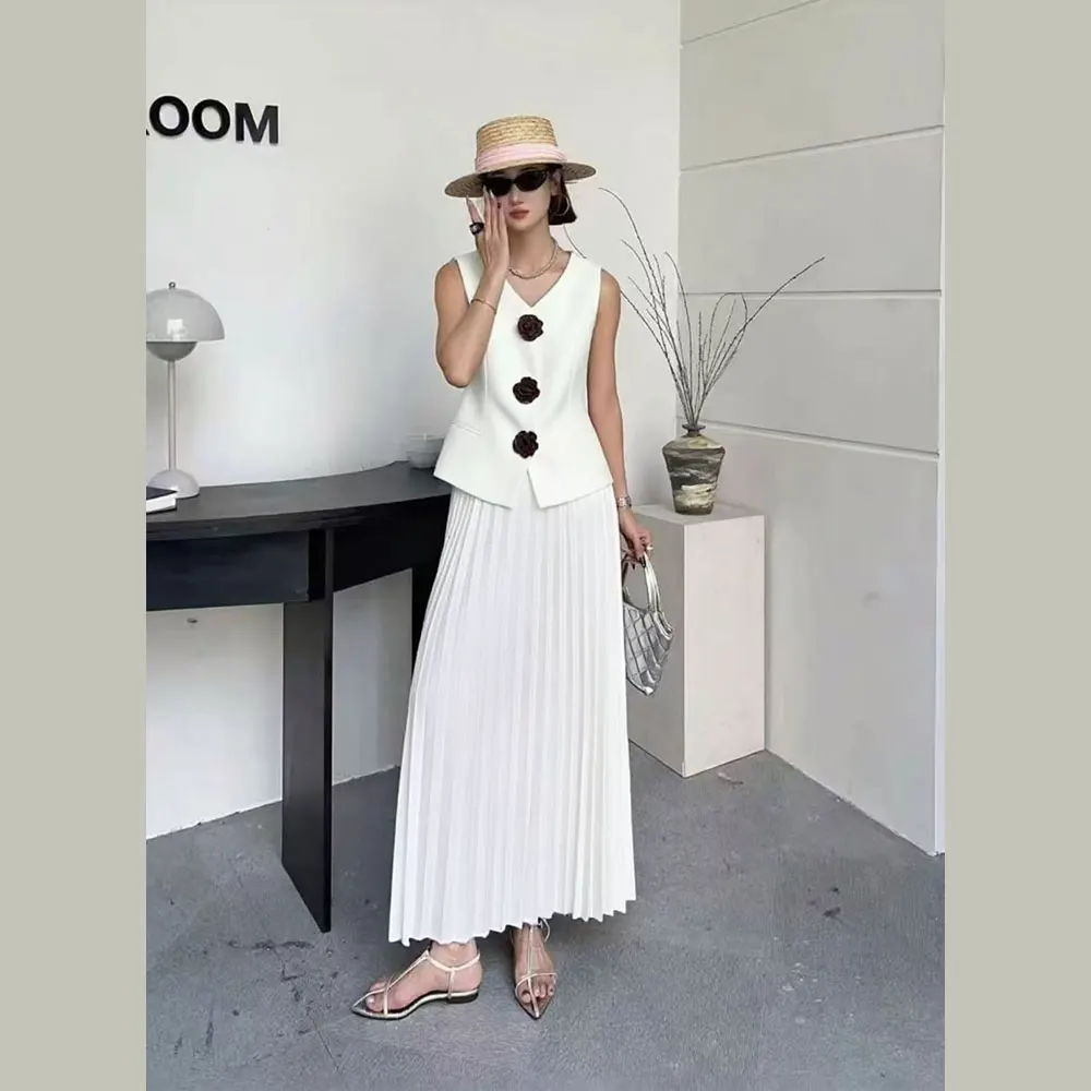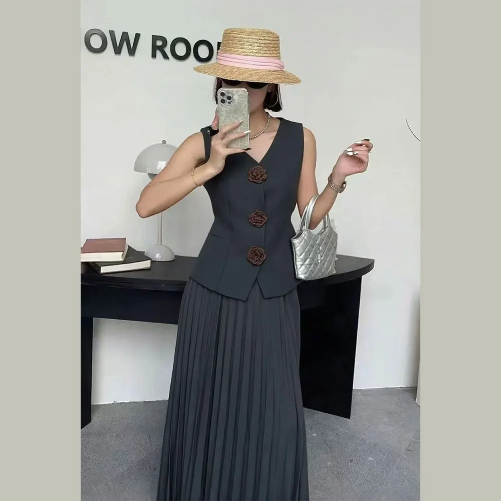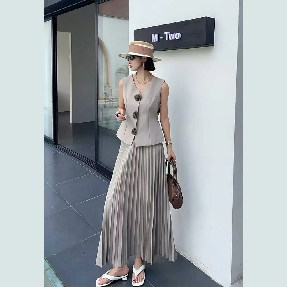 Women's Two-Piece Suit Set - Suit Fabric, Chic Vest & Pleated Skirt, Versatile, with Lining